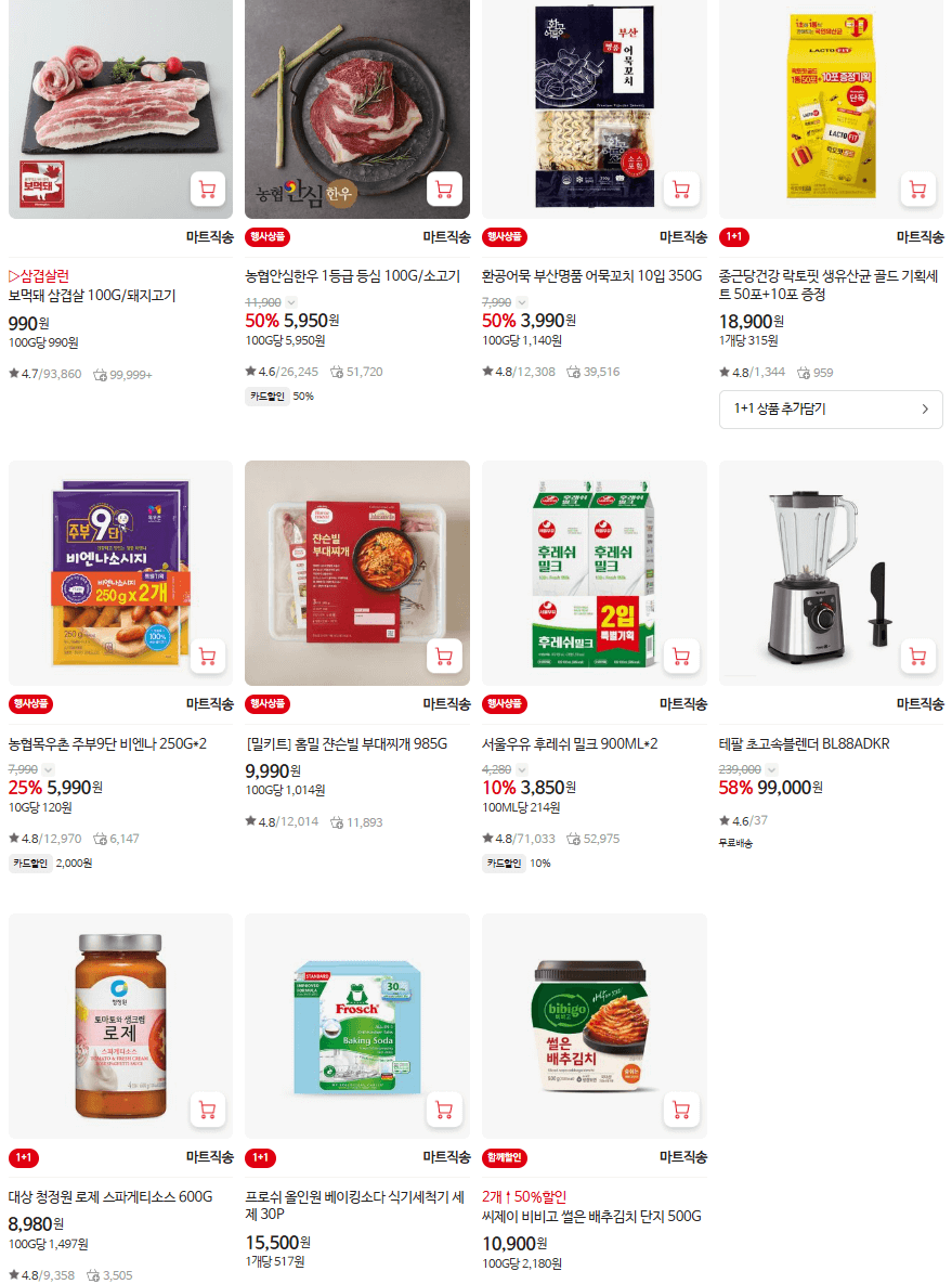 - 다양한 상품 구성: 신선식품, 가전제품, 패션 등 다양한 카테고리의 상품 제공