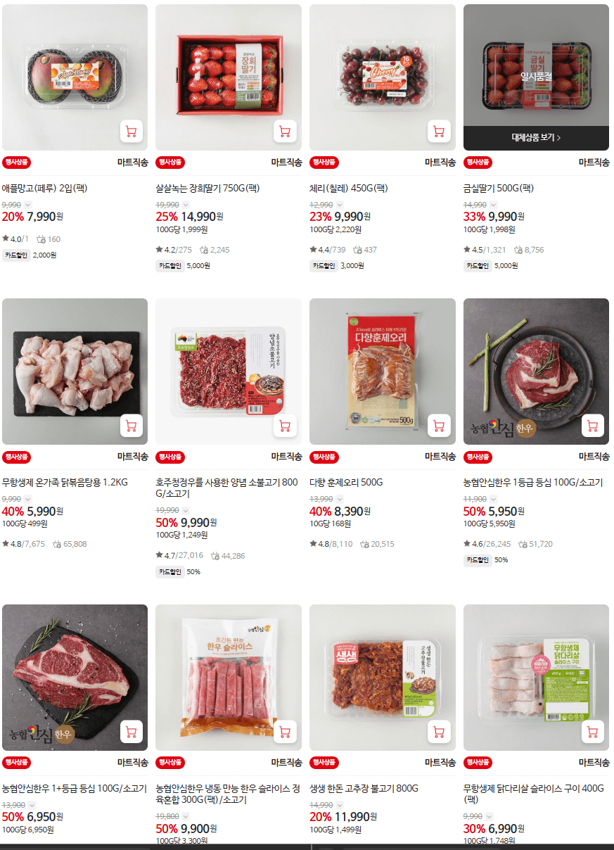 - 다양한 상품 구성: 신선식품, 가전제품, 패션 등 다양한 카테고리의 상품 제공