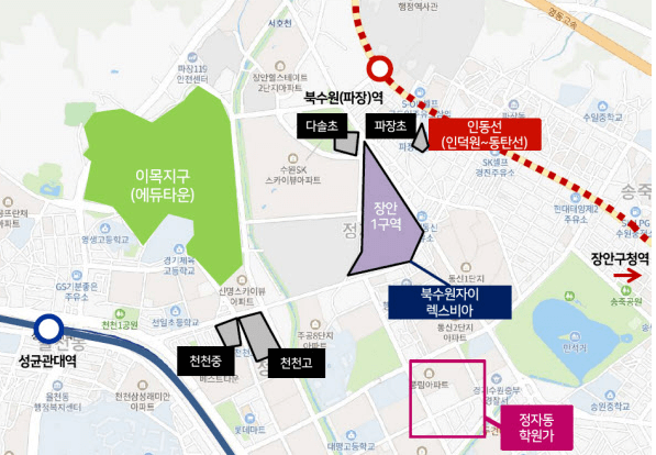- 공원 및 자연환경: 만석공원, 장안공원 등 녹지 공간 확보