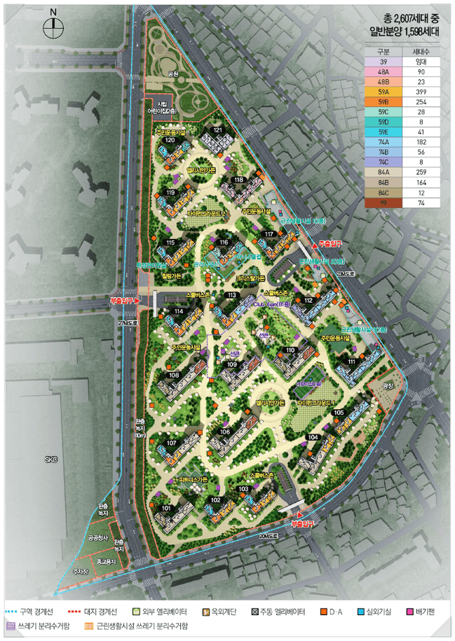 - 건물 구성: 지하 2층 ~ 지상 29층, 21개 동, 총 2,607세대 중 일부