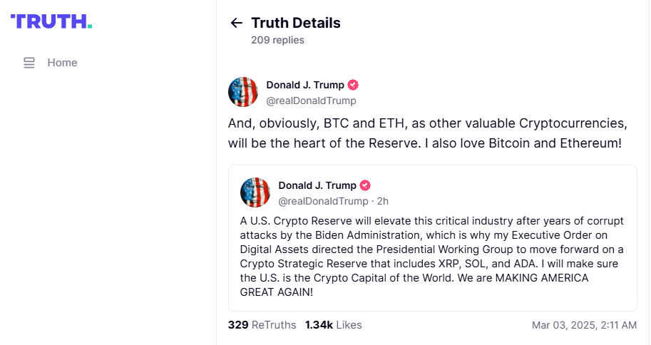 "A U.S. Crypto Reserve will elevate this critical industry after years of corrupt attacks by the Biden Administration, which is why my Executive Order on Digital Assets directed the Presidential Working Group to move forward on a Crypto Strategic Reserve that includes XRP, SOL, and ADA. I will make sure the U.S. is the Crypto Capital of the World. We are MAKING AMERICA GREAT AGAIN!"